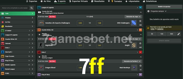 O 7ff oferece uma grande seleção de opções de apostas em e-sports com probabilidades competitivas